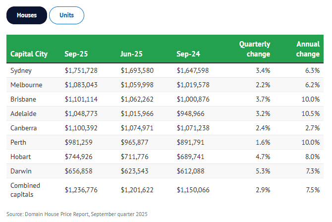The Queensland capital’s median house price rose $38,852 or 3.7 per cent over the September quarter, Domain’s latest House Price Report, released on Thursday, showed.