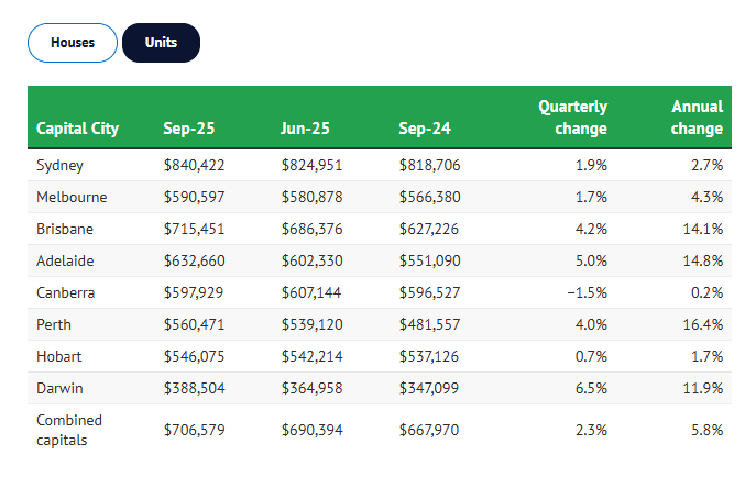 Unit prices also climbed to new records, collecting 4.2 per cent in three months to hit $715,451, cementing Brisbane’s position as the second-priciest capital for apartments for the second year running. It marks 18 consecutive quarters of growth, the longest upswing on record for the city.