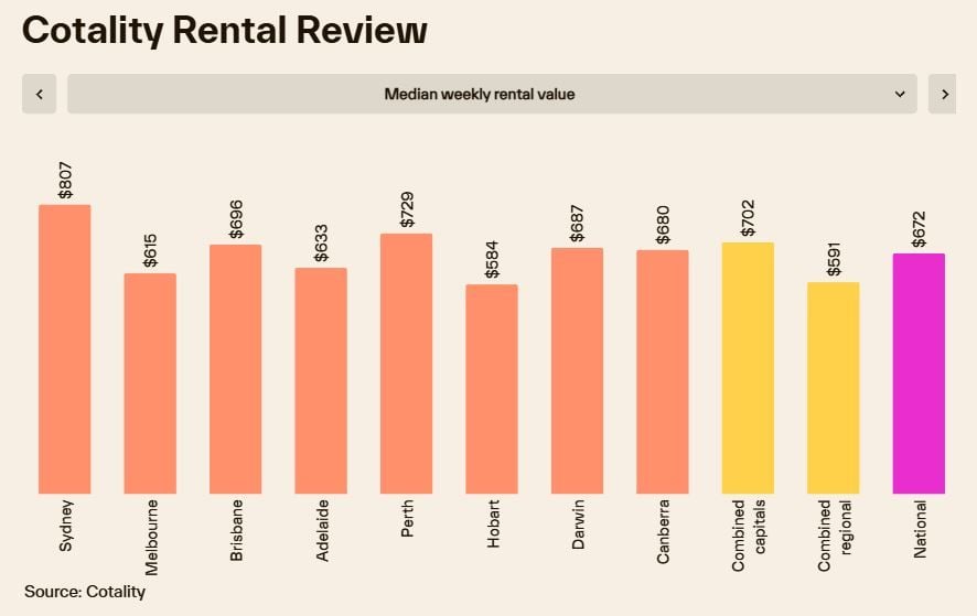 The median weekly rental value across Australia’s combined capital cities surpassed the $700 mark for the first time in August, before landing at $702 per week in September.